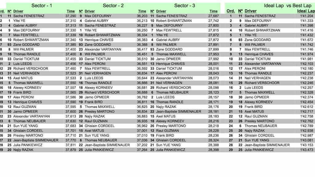 Thursday tests results – three sessions, potential ideal lap sheet and a pace comparison over a potential lap which is an average time of the top-3 drivers ideal times.